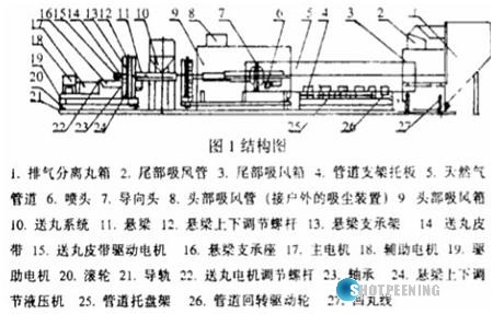 由于天然氣管道長度較長,采用常規(guī)的設備顯然不能滿足此件加工的要求,我們設計了噴九處理的專用設備-拋丸機,其結構簡圖如圖。
